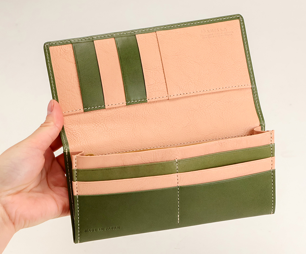 素材である栃木レザーはもちろんのこと、縫製も国内生産にこだわりました。高い技術を持つ日本の老舗革小物メーカーの熟練した職人が縫製しています。シンプルで美しいフォルムは、長年の経験に裏付けされた技術の結晶です。