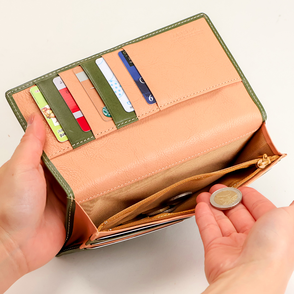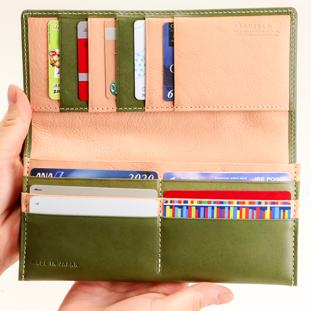 どちらでも対応できるベーシックデザインの二つ折り長財布です。