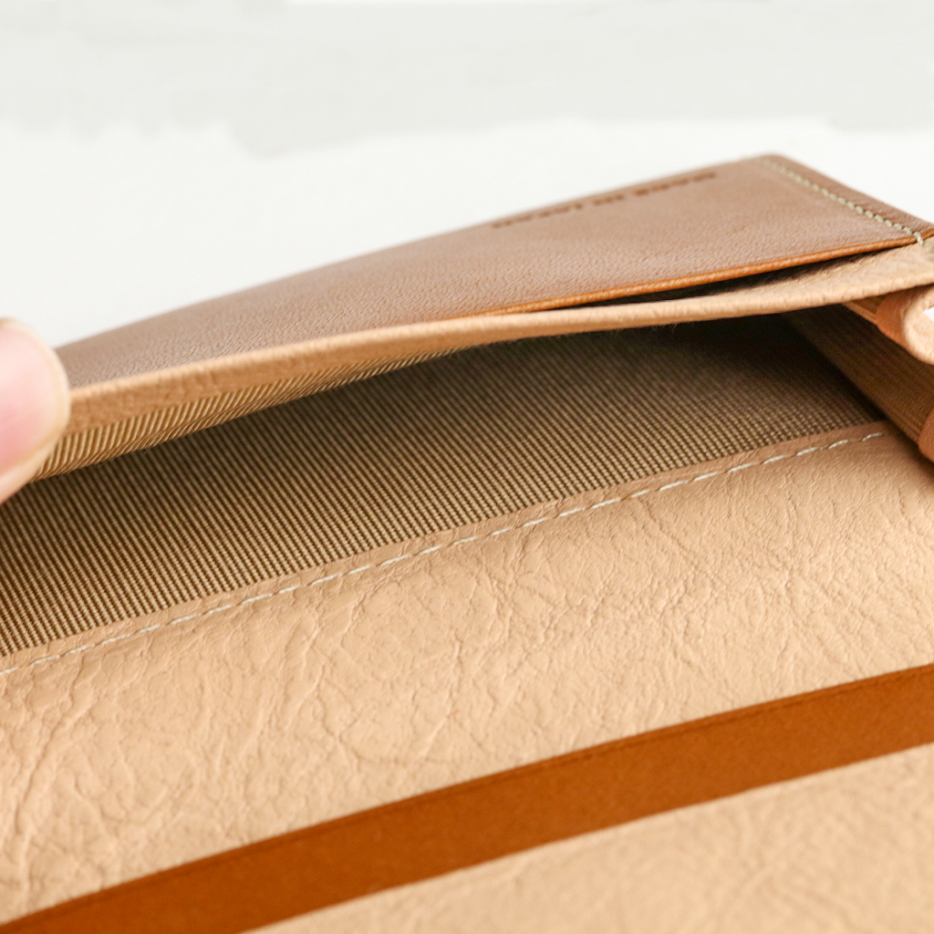 内側にヌメ革らしい明るいベージュカラーの牛革(栃木レザー)を使用しています。