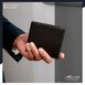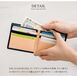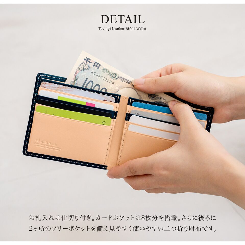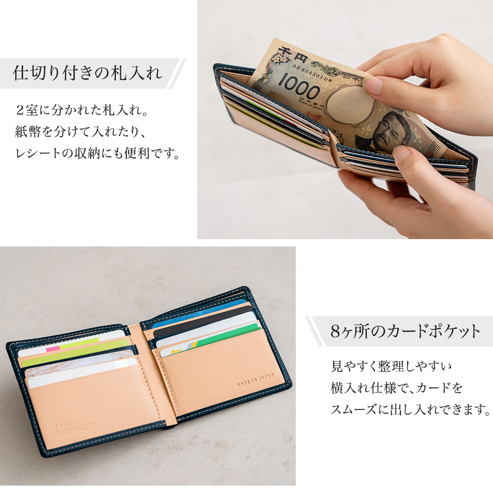 スリムな小銭入れなしタイプの二つ折り財布で、カードは8枚分つき。お札入れは二室に分かれているレシートやチケットなどの収納に便利。