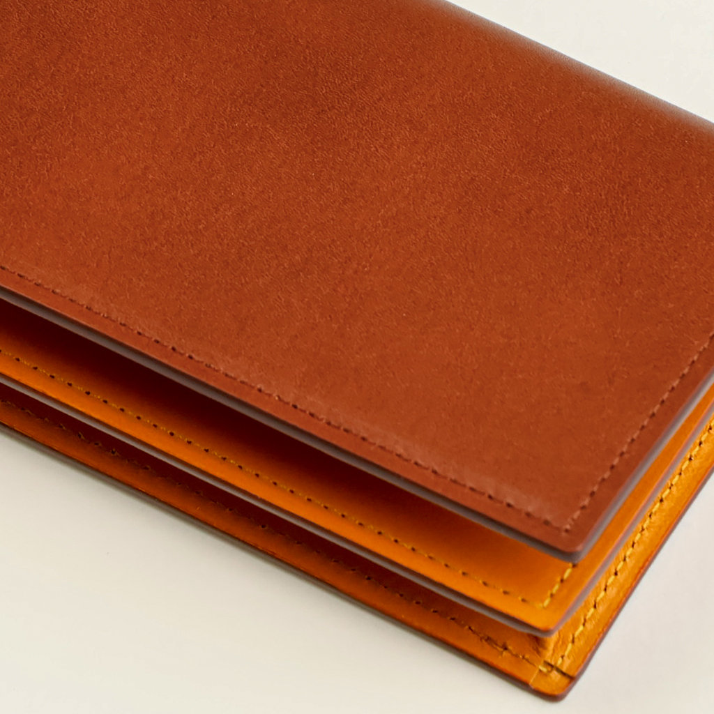 塗りと磨きを何度も繰り返し、磨き上げられた裁断面は、半透明な光沢感をもつ革の層が、何層にも透けて見える美しい仕上がりになります。