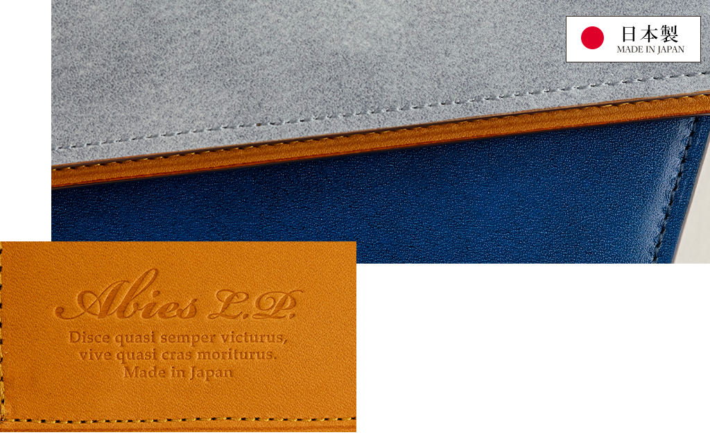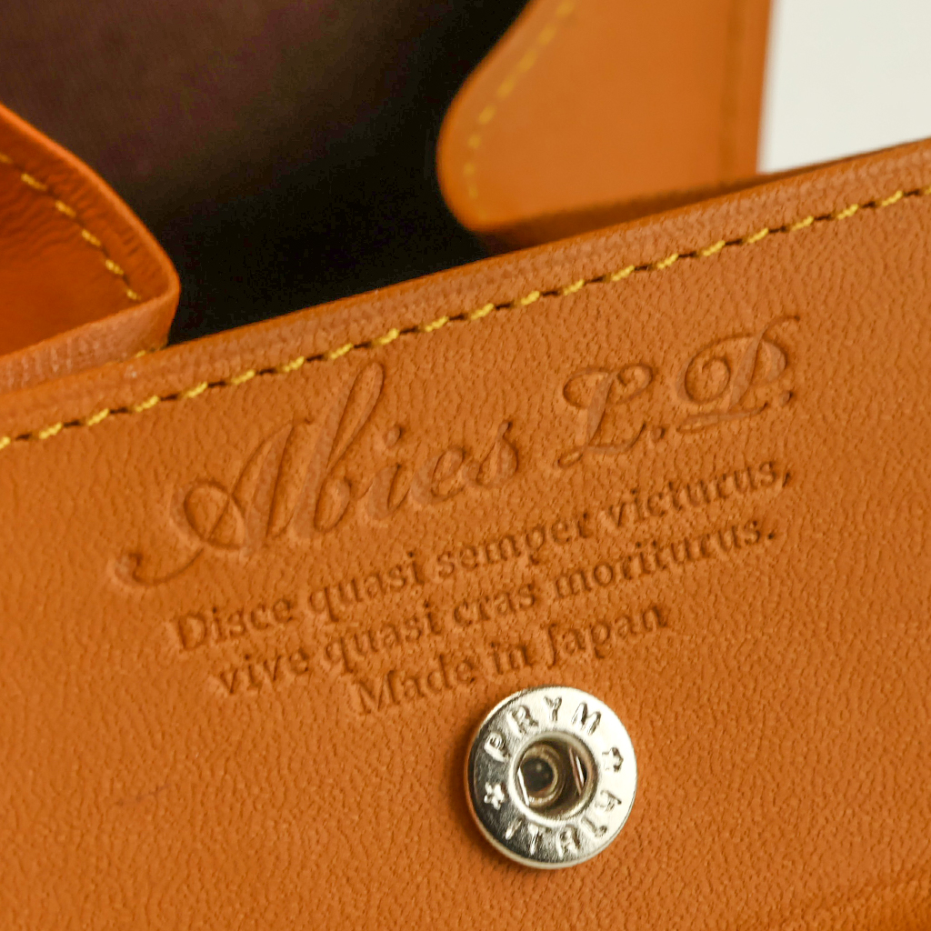 内側に「Abies.L.P」オリジナルロゴの型押し入り。開閉はスナップボタン式です。