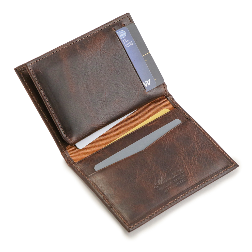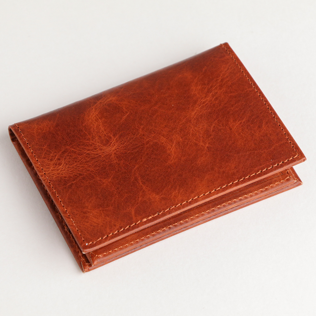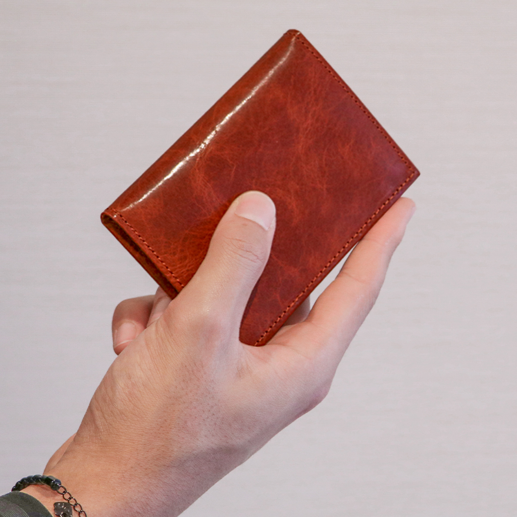 主に植物タンニンを使用してなめした混合なめしのヌメ革で、使い始めは硬いと感じられるかも知れませんが、使い込むうちに手に馴染み、革らしい風合いが得られます。なめし工程のあと、染料を用いて染色しています。表面の美しい濃淡のコントラストはワックスを手作業で豊潤に浸透させた後、プレス加工の熱により焼けてできたもので、表面に残ったワックスにより、美しい透明感を持った光沢と奥行き感が現れます。